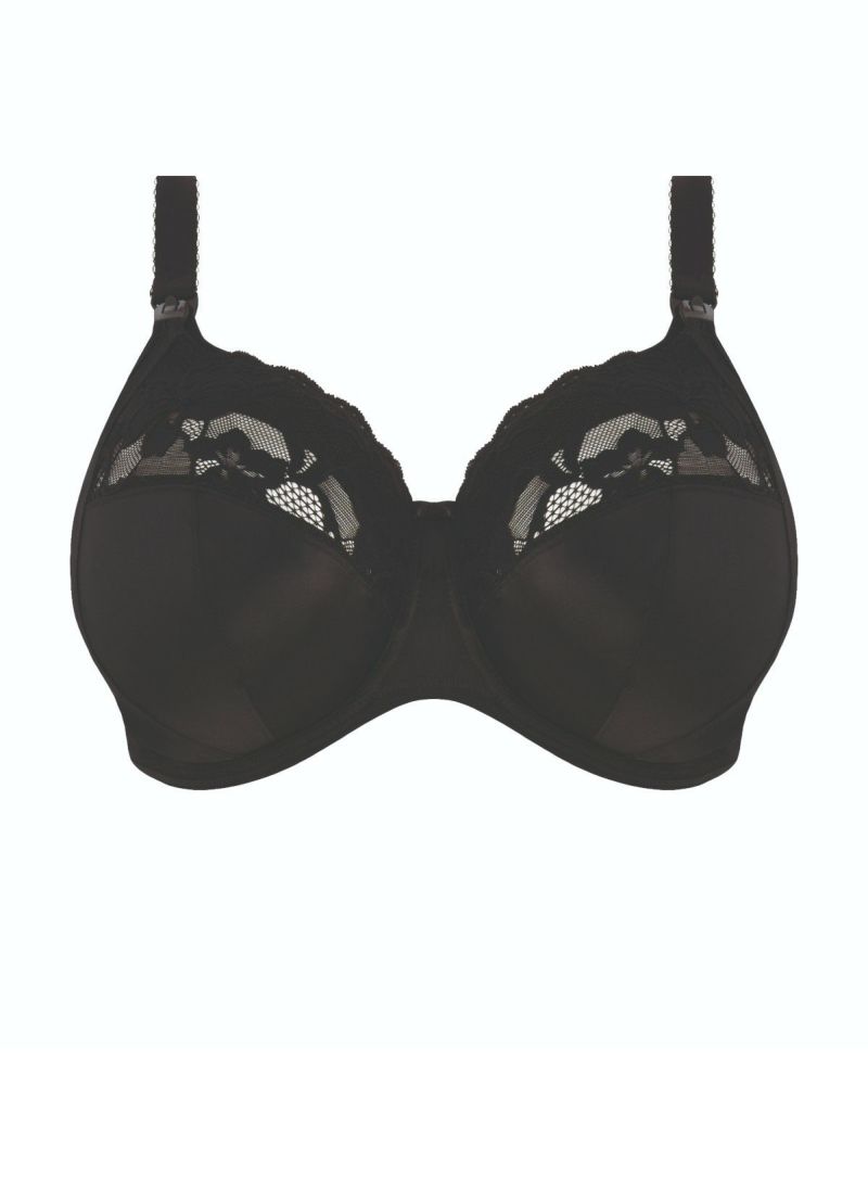 KKカップまでのサイズ展開で、ストレッチフローラルレースが素敵なElomi唯一の授乳用ブラ。簡単に開閉ができるワンクリップ式です。バンド付きアンダーワイヤー、3枚パネルカップ、追加のサイドサポートが快適なフィットを提供し、湿気を逃がして一日中涼しく乾燥させる素材が特徴です。
