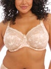 三枚パネル仕立てのカップとサイドサポートパネルが理想的な前方形状を提供し、ストレッチレースのトップカップが丸みのあるシルエットを作ります。柔軟性のあるネックエッジが快適なフィット感を確保し、可愛らしいリボンのディテールが全体を引き締めます。
