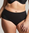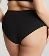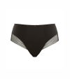 おへその下辺りまで、高さのあるディープブリーフです。 ややストレッチを効かせ、ボディにしっかりフィットしてくれるスタイル。バックスタイルはシンプルな1枚仕立て。前サイドにはレースパネルをほどこし、フェミニンな印象に仕上がっています。