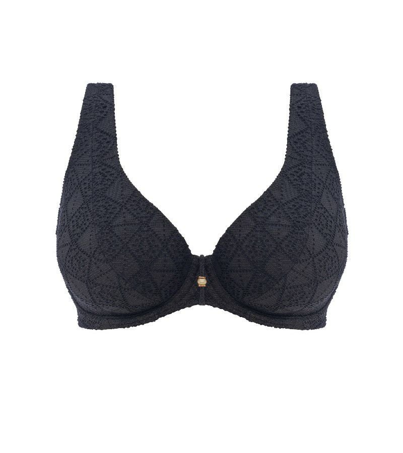 深く落ち込むセクシーなVネックに、縦のラインを強調するエロンゲーテッド・エイペックス仕様で、デコルテを美しく魅せるデザインです。カップ内側にはパワーネットを配し、自然なシェイプとしっかりとしたサポート力を実現。表面にはクロシェ風のオーバーレイを重ね、リゾート気分を高める繊細な表情に仕上げています。