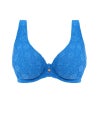 深く落ち込むセクシーなVネックに、縦のラインを強調するエロンゲーテッド・エイペックス仕様で、デコルテを美しく魅せるデザインです。カップ内側にはパワーネットを配し、自然なシェイプとしっかりとしたサポート力を実現。表面にはクロシェ風のオーバーレイを重ね、リゾート気分を高める繊細な表情に仕上げています。