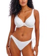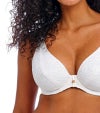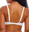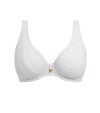 深く落ち込むセクシーなVネックに、縦のラインを強調するエロンゲーテッド・エイペックス仕様で、デコルテを美しく魅せるデザインです。カップ内側にはパワーネットを配し、自然なシェイプとしっかりとしたサポート力を実現。表面にはクロシェ風のオーバーレイを重ね、リゾート気分を高める繊細な表情に仕上げています。