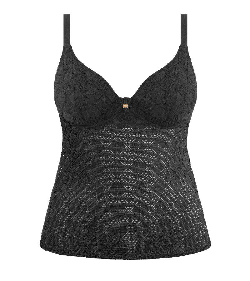 こちらのワイヤー入りプランジタンキニは、深めのVに落ちるプランジネックラインが、美しいデコルテを印象的に引き立てます。ワイヤー入りのカップは裏打ちを施し、しっかりとしたシェイプ力と安定したサポートを実現。背面はまっすぐにカットされたデザインで、アウターライクな雰囲気を添えています。