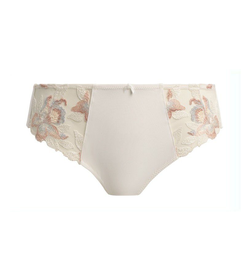 フロントレッグにルレックス糸が輝くディテールのマルチトーン刺繍が豪華な印象。透け感を控えたフロントパネルが安心感を提供し、柔らかなクリーンカット生地で滑らかな仕上がりとセカンドスキンのような着心地を実現、パンティラインも気になりません。中央の繊細なボウディテールが愛らしい魅力をプラスします。
