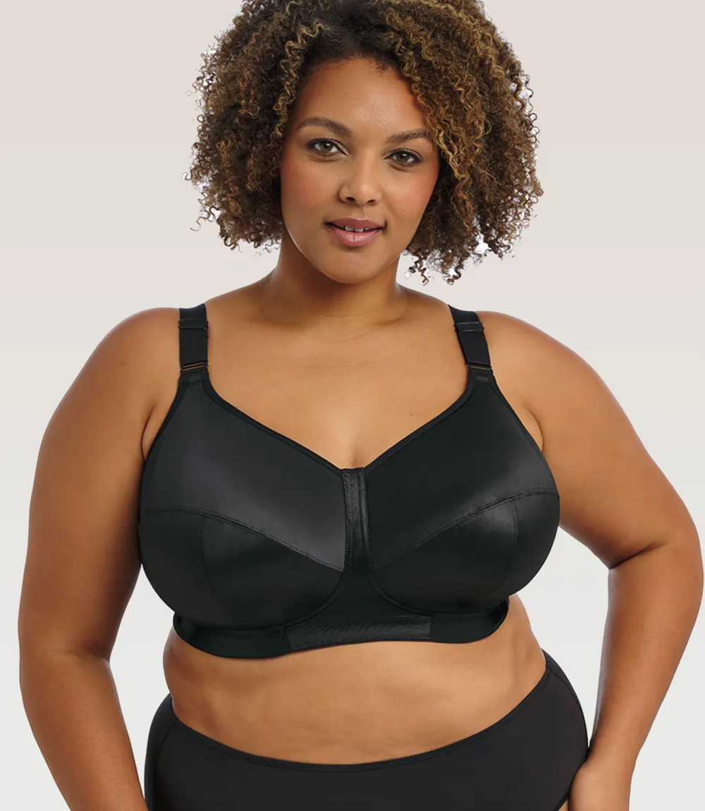 滑らかなシンプレックス素材の3枚パネルカップが、ボリュームのあるバストを美しく整え、ワイヤレスでも強力なリフトアップを実現します。