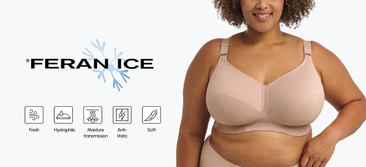 FERAN® ICE技術による吸湿発散性素材が、汗を素早く吸収し乾燥させます。暑い夏やアクティブな日でも、涼しく清潔な着心地をキープ。ボリュームバストを快適に支えながら、爽やかな一日を約束します。